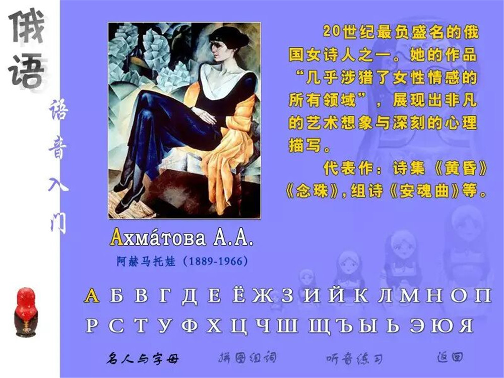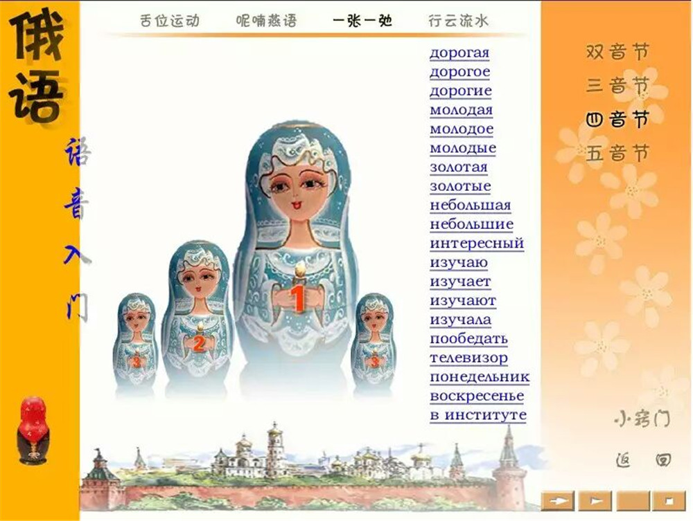 《我的第一本俄语语音》既适合高等学校俄语专业零起点的一年级学生使用,也可作为俄语初学者的自学教材,还可帮助有一定基础的俄语学习者改善语音学习的质量。教材包括纸质课本和多媒体软件两部分。纸质课本共7课,每课均包含字母、音位、语调、语音操、练习与游戏、诗歌与游戏等6个部分。其中对元音、清浊辅音、元音弱化、软硬辅音等语音现象作了较系统的梳理,并为学生使用多媒体光盘提供了学习策略。多媒体软件则创设了更加自由灵活的学习环境,学生可以自主选择学习内容与练习方式。除了上述6个部分以外,软件中还增加了单词表,收入了常用单词923个;“练习与游戏”部分增加了拼图组词和听音练习,内容与形式都更加丰富有趣、更具互动性。