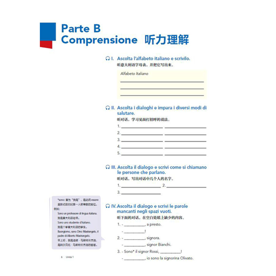 《大学意大利语听说教程1》10个单元,每个单元都设计一个主题,由4 部分构成:"热身"环节的主要目的在于引入单元主题,通过图片、简单对话等形式让学生进行自由联想,对本单元所涉及的词汇、短语、句子、文化现象等等有一个大致的了解;"听力理解"环节给学生提供数个听力训练,每个情景对话搭配各种练习,题型多样,形式灵活,偏重趣味性,以吸引学生注意力、调动参与积极性为目的;"能力拓展"环节的主要目的是增强学生的创造性思维能力,培养其对于之前所学知识点活学活用的能力,全面提高学生的语言听说水平;"自我评估"环节给学生提供一个自我评估的机会,学生通过相关听力练习,对本单元的重点难点进行再次巩固,自我检验学习效果,从而形成一个完整的学习过程。前7 个单元专门配有语音练习,帮助初学者进一步规范语音语调。在"热身""听力理解""能力拓展"和"自我评估"这四个环节中均适当穿插词汇讲解、扩展知识点汇总、文化现象解读、语法点分析等内容。书后附有参考答案,配有听力原文,供教师和学生参考。