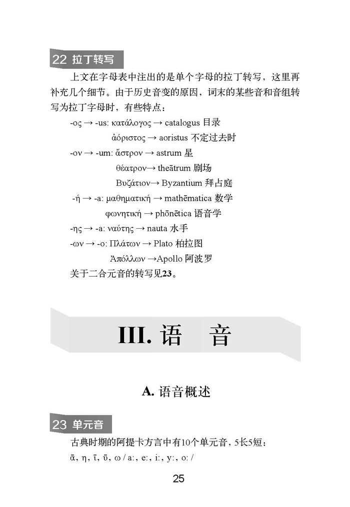 书中在概述印欧语系的基础上,介绍了希腊语的历史背景、文字沿革、语音、形态、构词和句法。每条语法规则都有足够的例证,所有例句都附译文,单词的形式和意义都有注释,有些地方还借用英语来辅助解释。书中凡有关联的内容都注明参见的节码,以便于通读或选读、精读或浏览。书末附有现代希腊语简介(见附录Ⅱ)、术语索引、希腊语词汇索引、汉语—希腊语词汇表以及英语词汇索引。