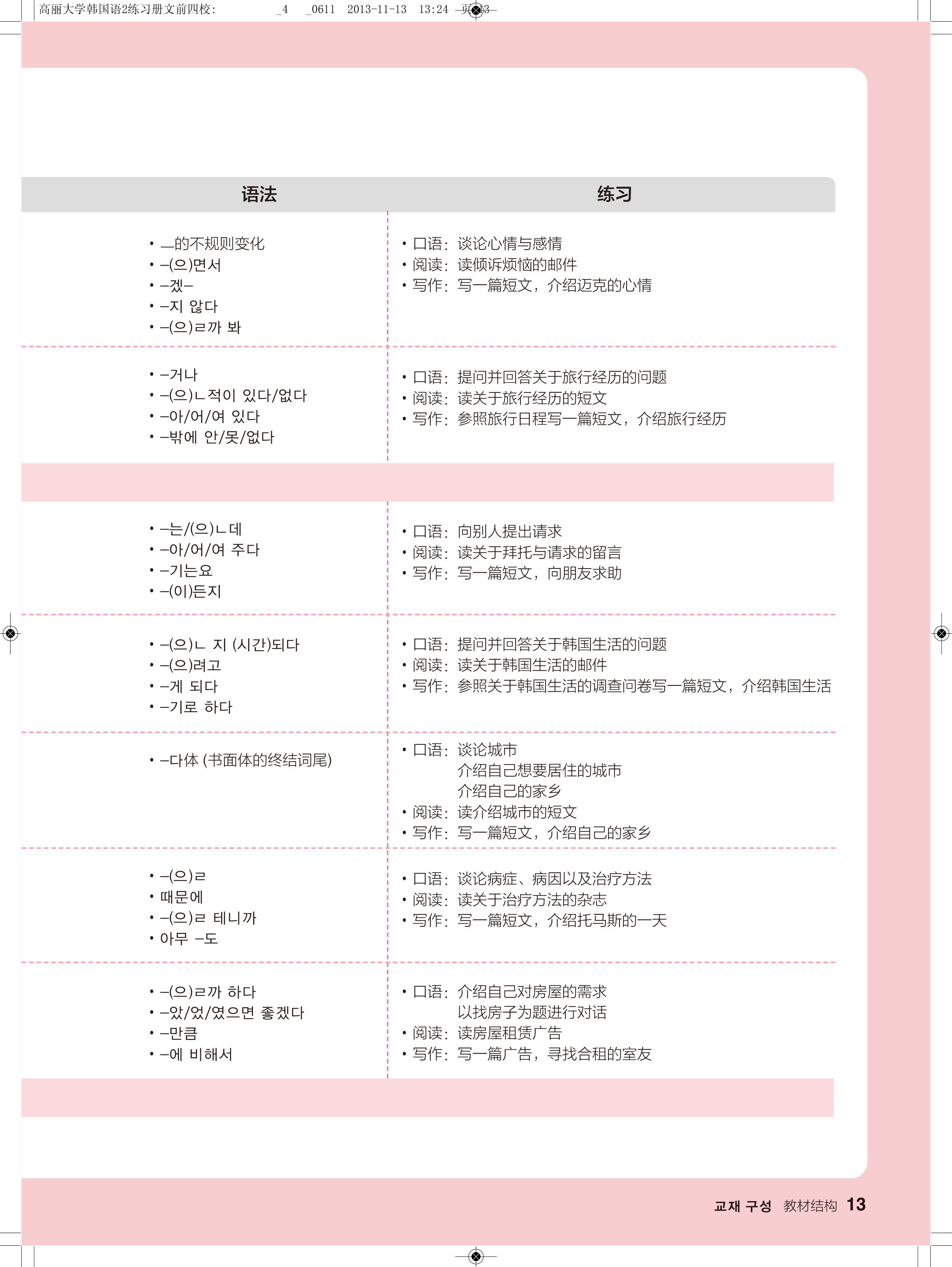 《高丽大学韩国语同步练习册》是为初级韩国语学习者而编写的练习册,初级学习者可以通过本教材轻松地巩固所学过的词汇、表达方式和语法。该练习册重点关注学习者在现实生活中可能用到的主题和技能,因而内容编排包含了大量各式各样的练习。旨在通过这些练习,使学习者更快地提高韩国语语言能力。如果将该练习册与主教材搭配使用,学习者韩国语语言技能的提高更将事半功倍。此外,本书内容结构独具匠心,主旨是希望通过帮助学习者准确地理解语法结构,并进一步掌握其在句子中的正确应用,从而使学习者最终能够自然而然地应用他们所掌握的韩国语。学习者在完成词汇、表达方式以及语法练习,各种语言环境下的口语、阅读以及写作练习后,能够掌握相应的语言交际能力,实现有效的沟通和交流。