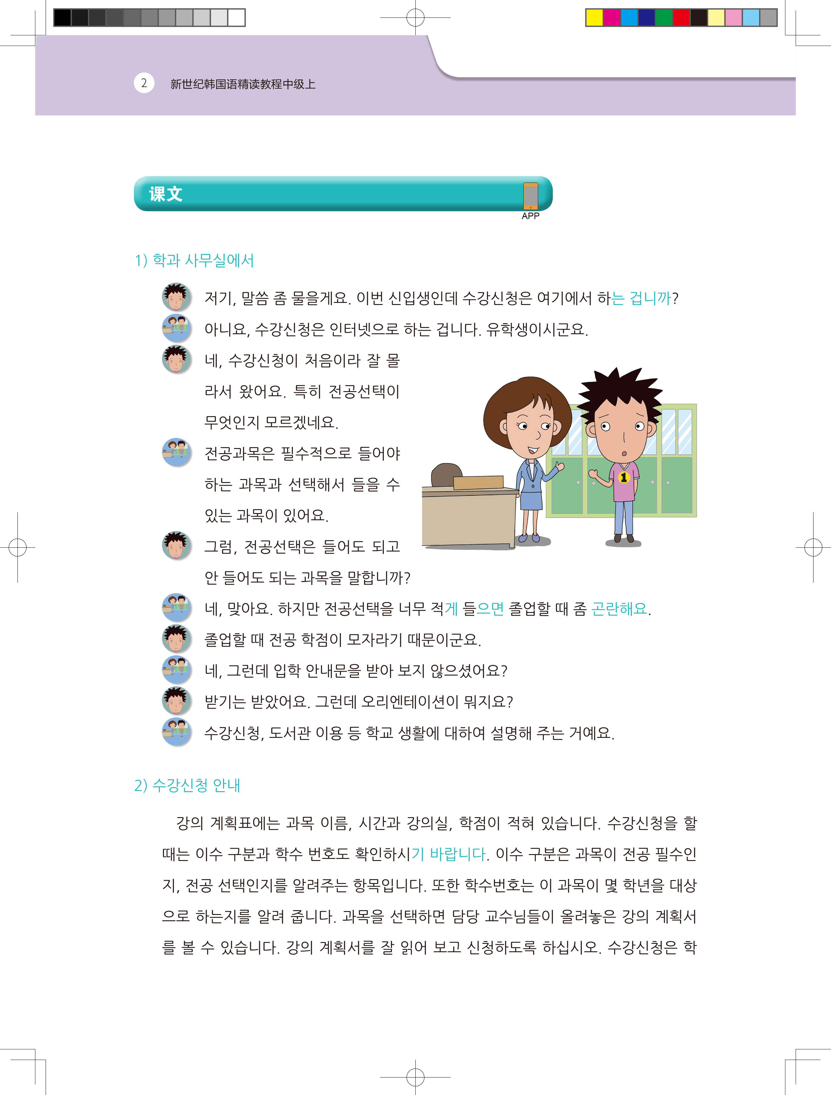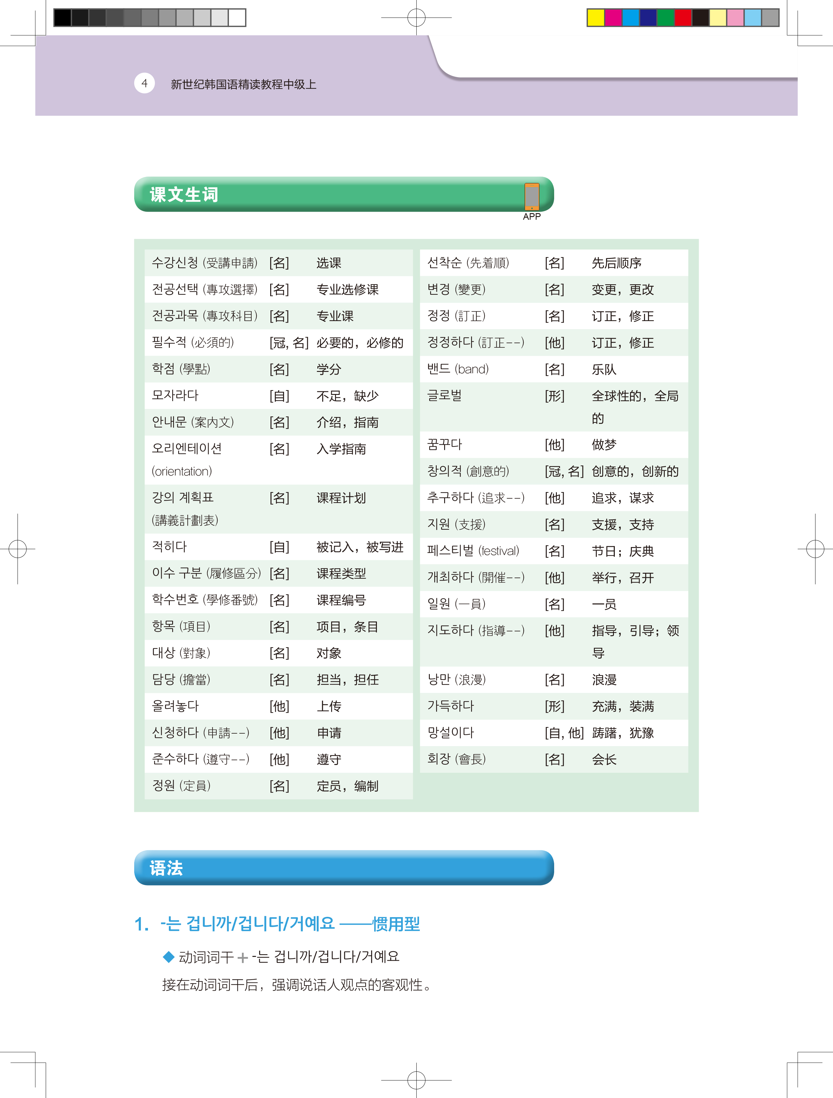 《新世纪韩国语精读教程中级上》是新世纪韩国语的重点教材,由中韩两国专家联手打造。教材编写时,编者依托自身多年韩语教学经验,针对中国学习者的学习特点选取语料。编写过程中,格外关注语料的实用性、语法点的合理配置、内容难易度的把握、口语与书面语的合理搭配等问题,帮助学习者在轻松愉快的学习氛围中循序渐进地提高韩国语水平。教材注重提高语言运用能力,以在韩国留学、工作时接触到的主题为中心,场景贴近现代日常生活,语言生动活泼。培养学习者用地道、标准的韩国语表达思想、情感,再现生活经验。