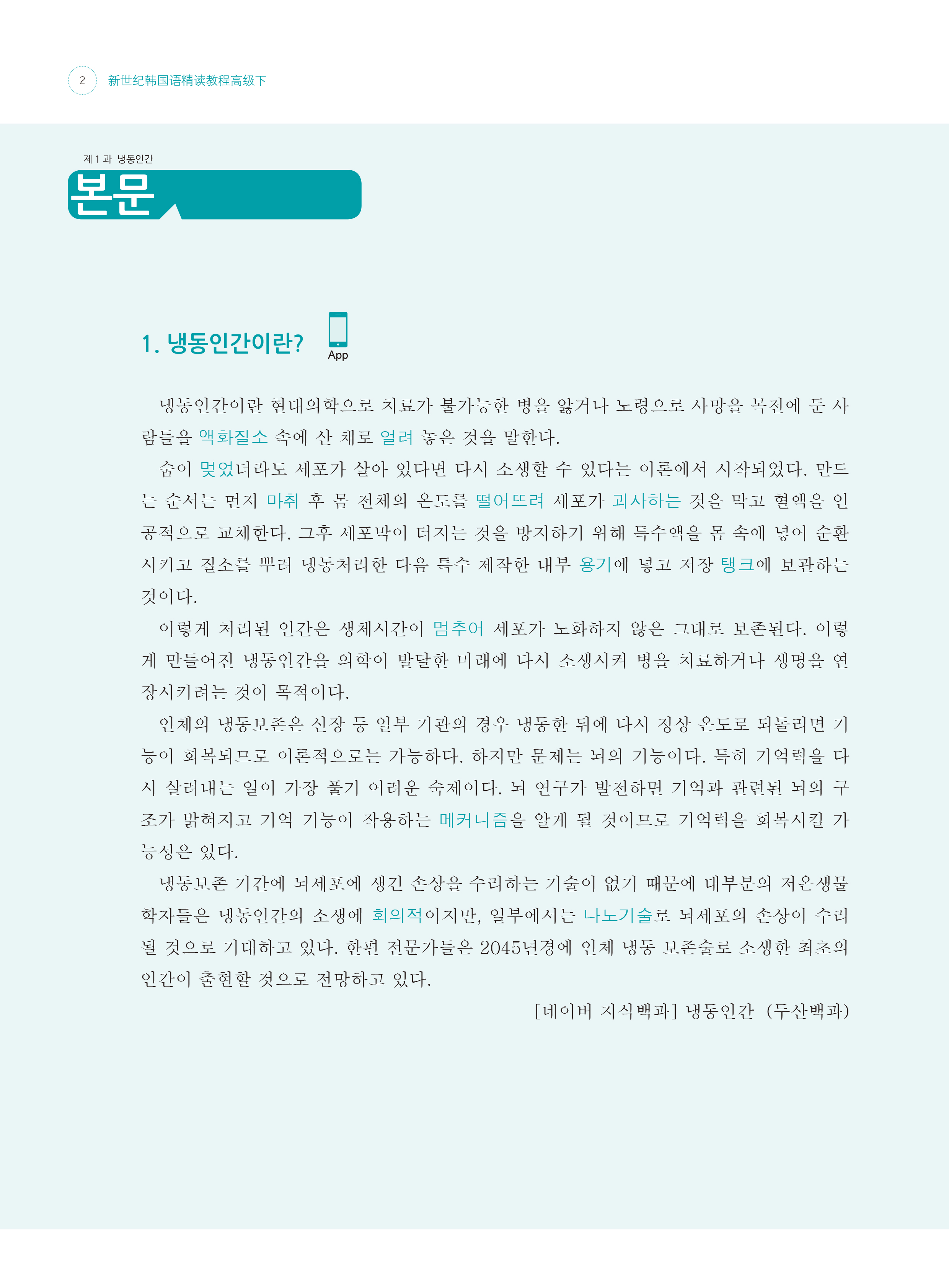 《新世纪韩国语精读教程高级下》以在韩国留学、工作时实用的主题为中心,并含有相关中国文化内容,教材内容新颖、生动、全面、实用。内容由课文、生词、语法、练习题组成。在教材的后半部附录了课文翻译、练习题答案,供学习者参考。