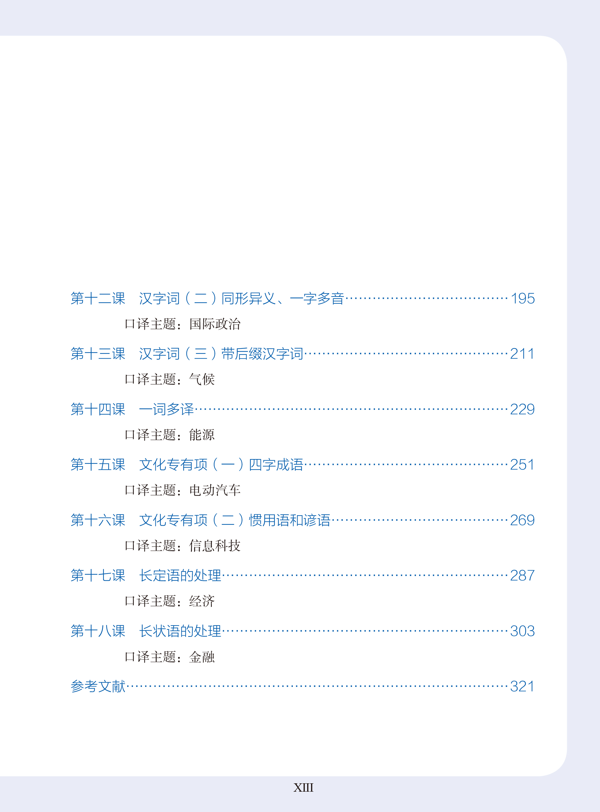 《韩中口译技巧与实践》总共由十八课构成,前六课专门属于口译的基本技巧,包括口译原则、言谈结构、信息听辨、记忆训练、笔记技巧、常用套句。主要讲授如何在听的过程中加快对源语信息的理解与分析,怎样筛选与提炼核心信息并迅速抓住逻辑关系,再通过笔记来巩固记忆,学会利用常用套句来提高口译的速度与准确性,为进入交替传译做准备。第七至十八课采取技巧与专题相结合的方式,技巧部分以韩中口译中的关键词和问题词为主,也包括长定语和长状语的处理。关键词包括句间连词、表意概念词和表意概念词,问题词包括专有名词与专业词汇、汉字词(同音异义、字序换位、同形异义、一字多音、带后缀汉字词)、一词多译、文化专有项(四字成语惯用型和谚语)等。技巧讲解内容均为基础韩中口译中最容易造成干扰的因素,具有较强的针对性,从词汇到文化因素,再扩大到句子的处理。