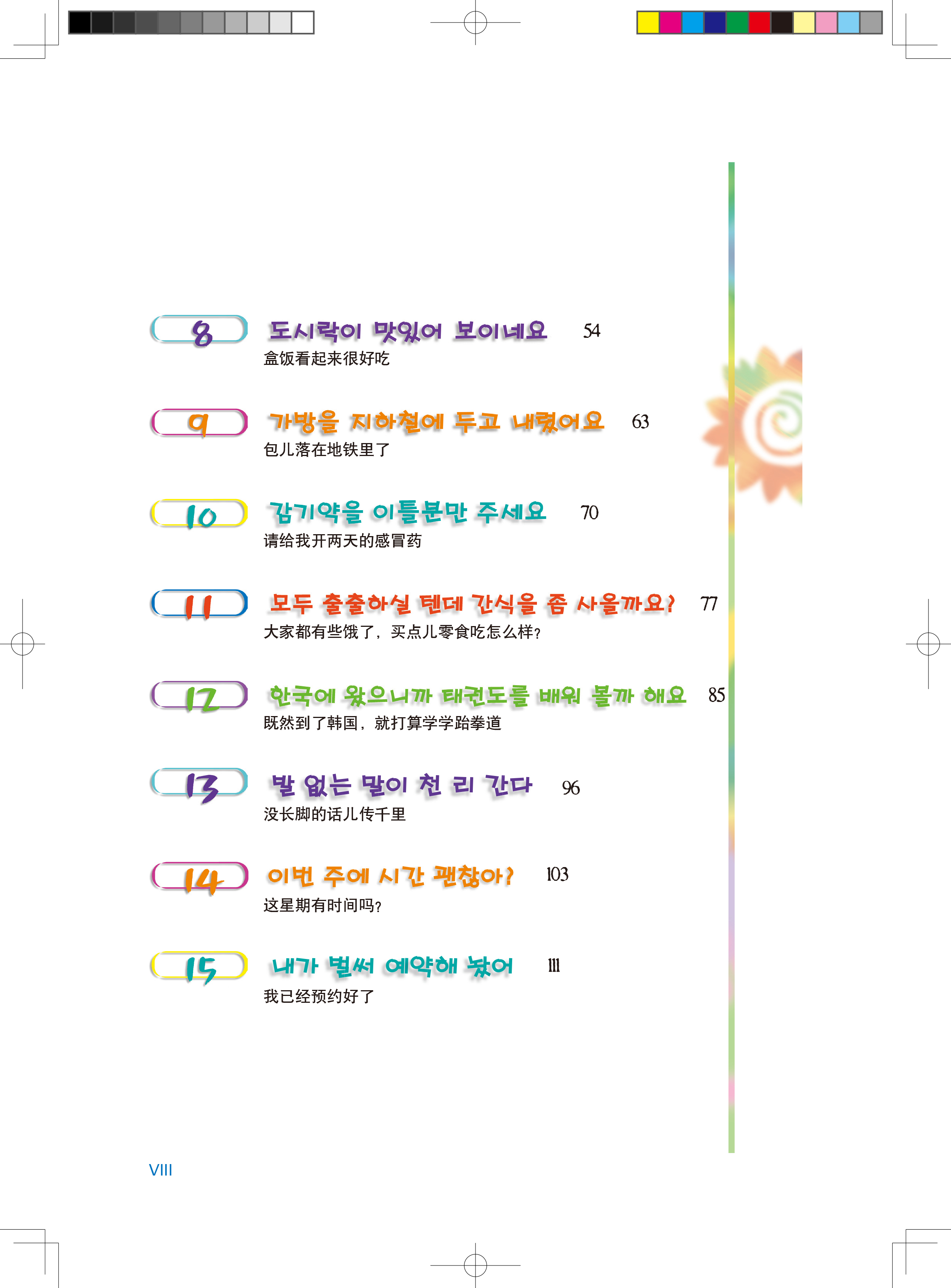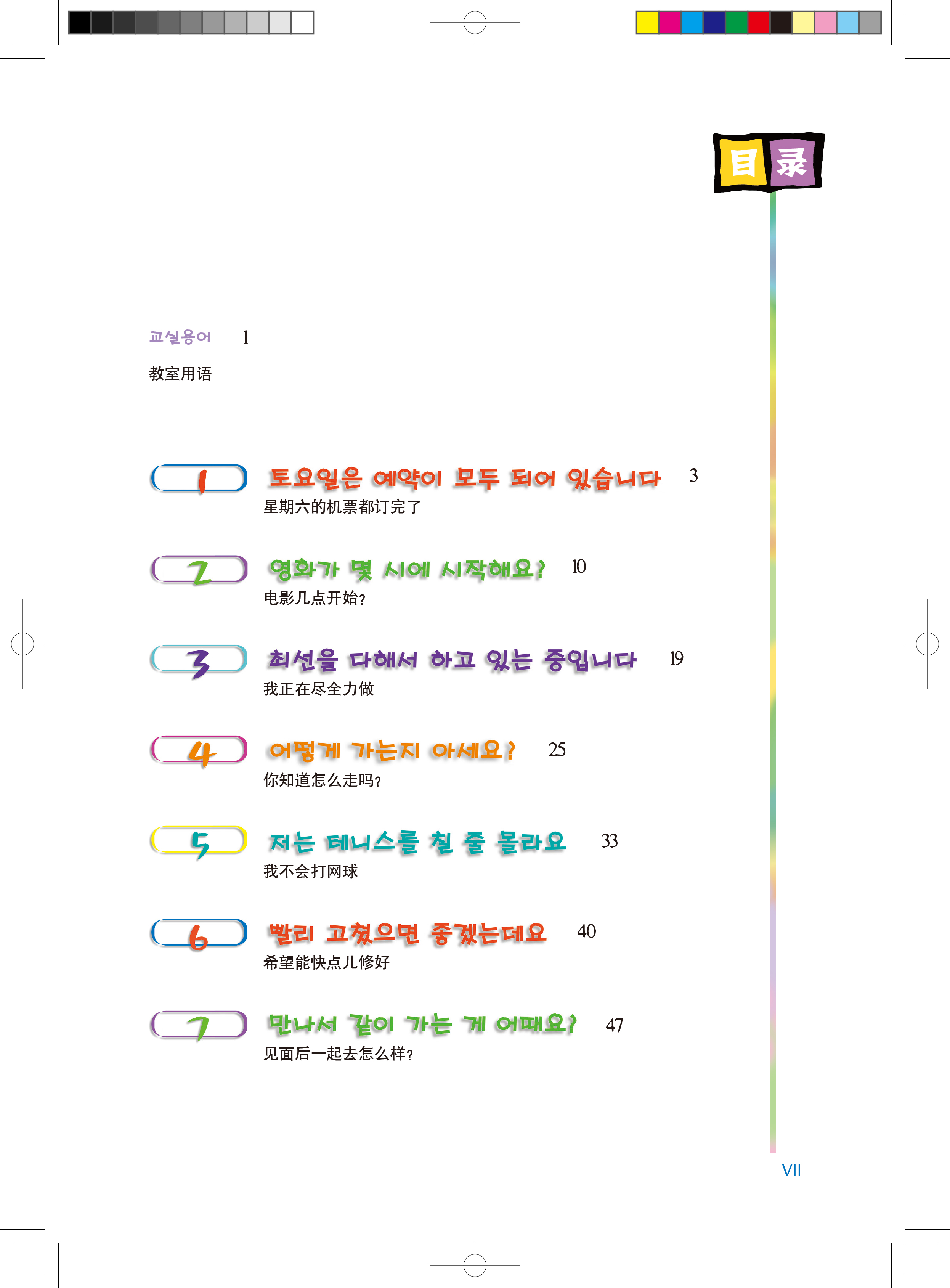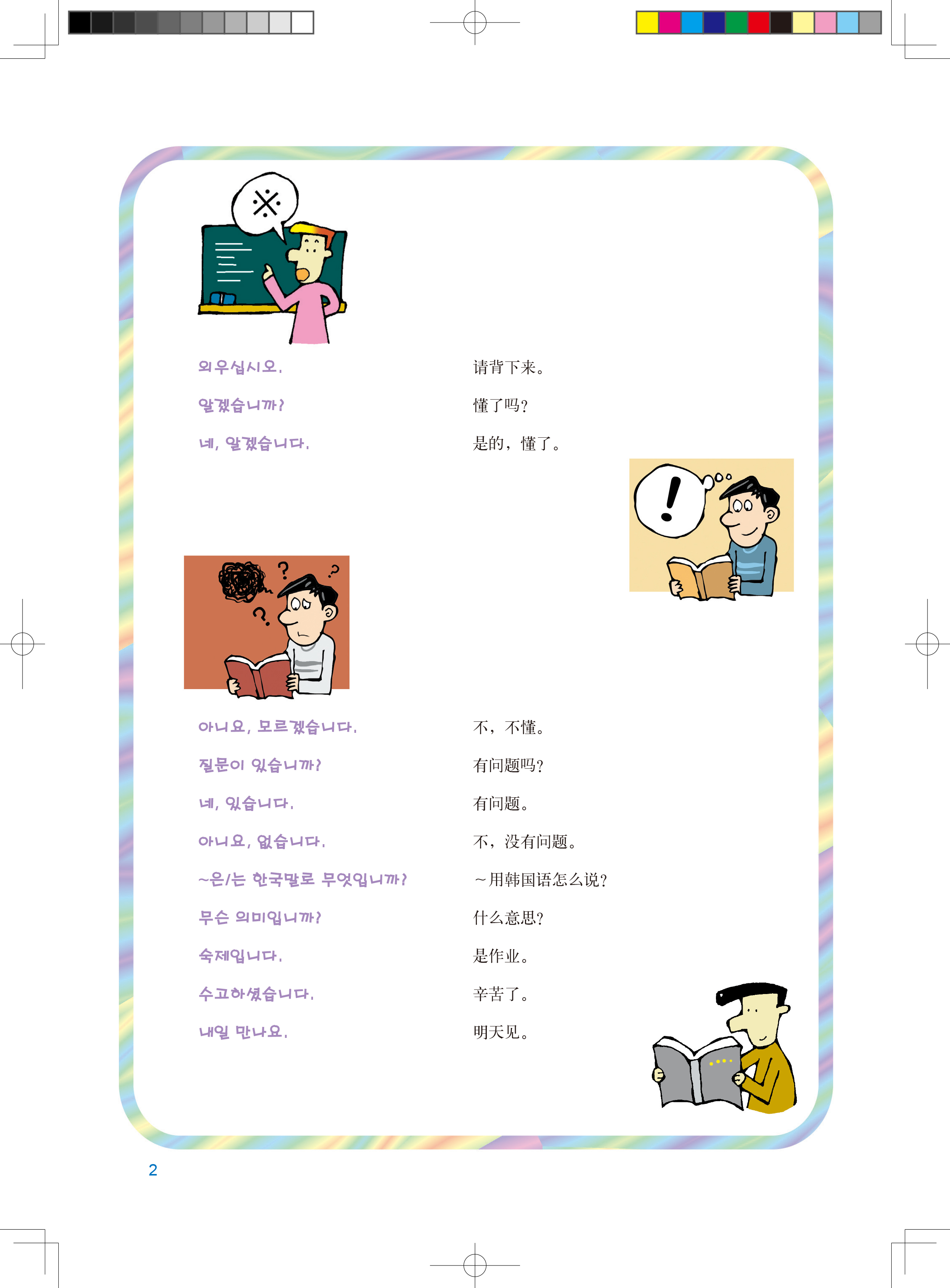 二,注重实际会话能力的培养。学习者都想在短时间内说一口标准的韩国语,因此本教材也将重点放在了学生会话能力的培养上。每册的主教材为学习者设计了15个自然生动的会话场景,包括常用的经典句式。