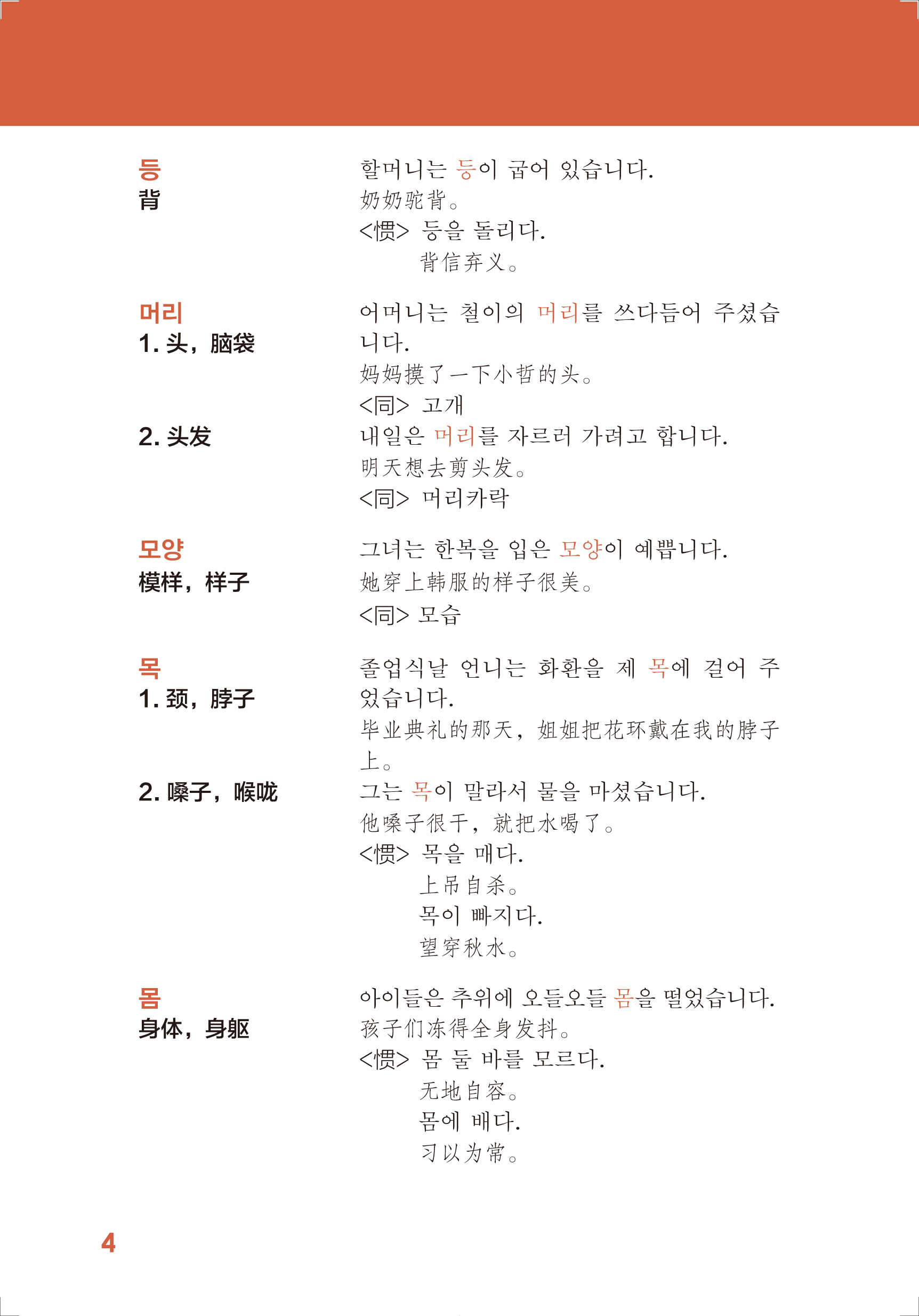 《新韩国语能力考试初级词汇语法红宝书》收录了新韩国语能力考试初级常用词汇及语法。词汇篇按照名词、代词、数词、动词、形容词、冠词、副词、感叹词分类,每个类别又按照词义具体分类,并以单元的形式呈现。每个词条后附有例句和译文,以便学生更好地理解词汇的意义。而且为了扩展学生的知识量,每个词条后还补充了反义词、同义词等相关词汇和惯用型、俗语、谚语等相关联的知识点。语法篇分为连接词尾、终结词尾、其他词尾、惯用型、助词五个单元。每个语法点后附有例句和译文。