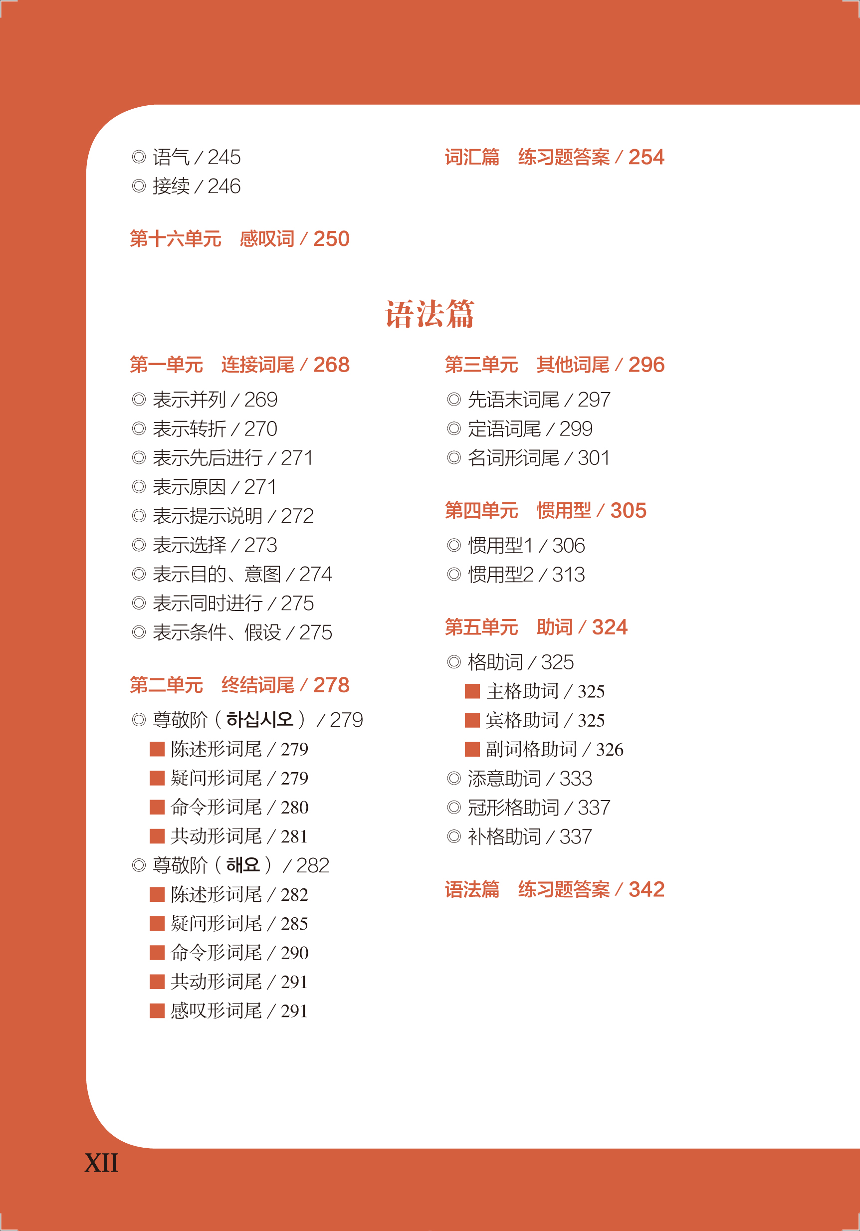 《新韩国语能力考试初级词汇语法红宝书》收录了新韩国语能力考试初级常用词汇及语法。词汇篇按照名词、代词、数词、动词、形容词、冠词、副词、感叹词分类,每个类别又按照词义具体分类,并以单元的形式呈现。每个词条后附有例句和译文,以便学生更好地理解词汇的意义。而且为了扩展学生的知识量,每个词条后还补充了反义词、同义词等相关词汇和惯用型、俗语、谚语等相关联的知识点。语法篇分为连接词尾、终结词尾、其他词尾、惯用型、助词五个单元。每个语法点后附有例句和译文。