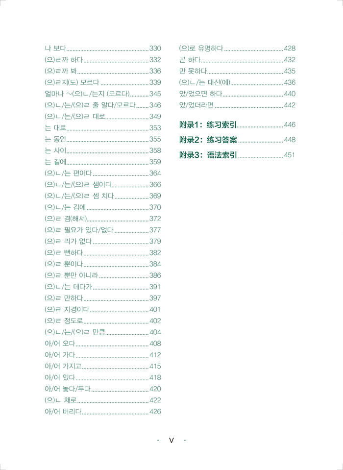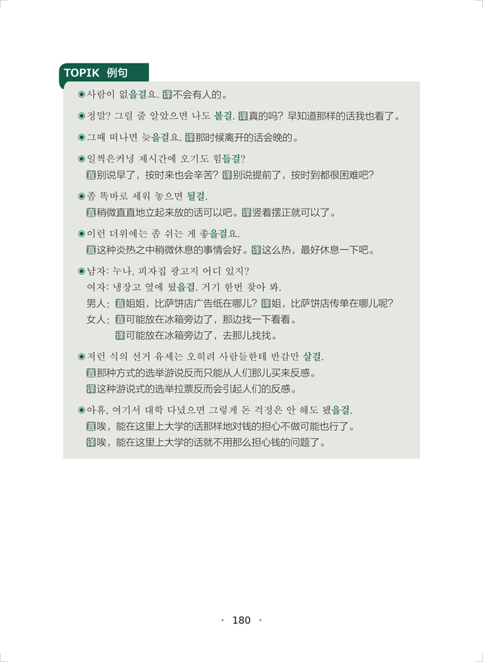 《韩国语实用语法教程中级-NEW TOPIKII必备语法+实战训练》精选出学习者在学习韩国语的中高级阶段和准备新韩国语能力考试中高级(TOPIKⅡ)时必须掌握的150 个语法点,包括19 个助词、41 个词尾和90 个惯用型三个部分,对其进行详细的讲解,深入挖掘语法点的深层含义,便于学习者理解和记忆。同时在多个语法点之间建立联系,减轻学习者记忆的负担。在讲解语法点时,列举大量例句,帮助学习者在具体的语境中理解语法的内涵。另外语法讲解浅显易懂,适合初学者自学。