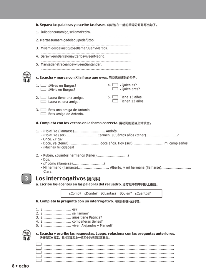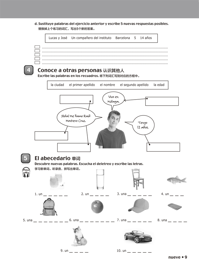 《快乐西班牙语(青少版)1练习册》从属于快乐西班牙语(青少版)系列,为外研社从西班牙EDELSA出版集团引进的一套以交际功能为基础的西班牙语教材。经国内教学一线明师编译,适用于以汉语为母语的中学及广泛零起点的西班牙语学习者。全套教材梯度较缓,循序渐进,对应欧洲语言共同参考框架A1-B2级,包含学生用书与练习册,同时配有二维码MP3音频及数字学习资源。该套教材教学体系完整,结构清晰,设有听说读写及互动语言学习环节,语法、词汇板块,语言活动与游戏项目,多元文化及素质培养元素渗透等内容。本册为《快乐西班牙语(青少版)1学生用书》的配套练习册,对应A1级别。