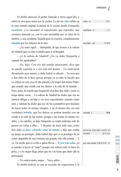 本册教程为文学专册。经过精挑细选,采用了27篇西班牙及拉丁美洲作家的作品,除一个中篇小说(节选)外,其余均为短篇小说,基本是名家名作。选篇内容健康向上、启迪智慧,知识性与趣味性兼具,可读性与思想性并重。语言纯正、精练,保证入选语篇的原汁原味。课文长短、难易,题材的选择,都体现了由浅入深、循序渐进的原则。篇章后设有帮助学生理解文章内容的练习及思考题,强调学生对所读文章的总体理解和把握,以提高其阅读能力与兴趣。“必读篇”和“选读篇”为学生提供了更多阅读空间和学习途径。希望西班牙语学习者翻开这本书时,能感受到阅读的愉悦,在学习的道路上更进一步!